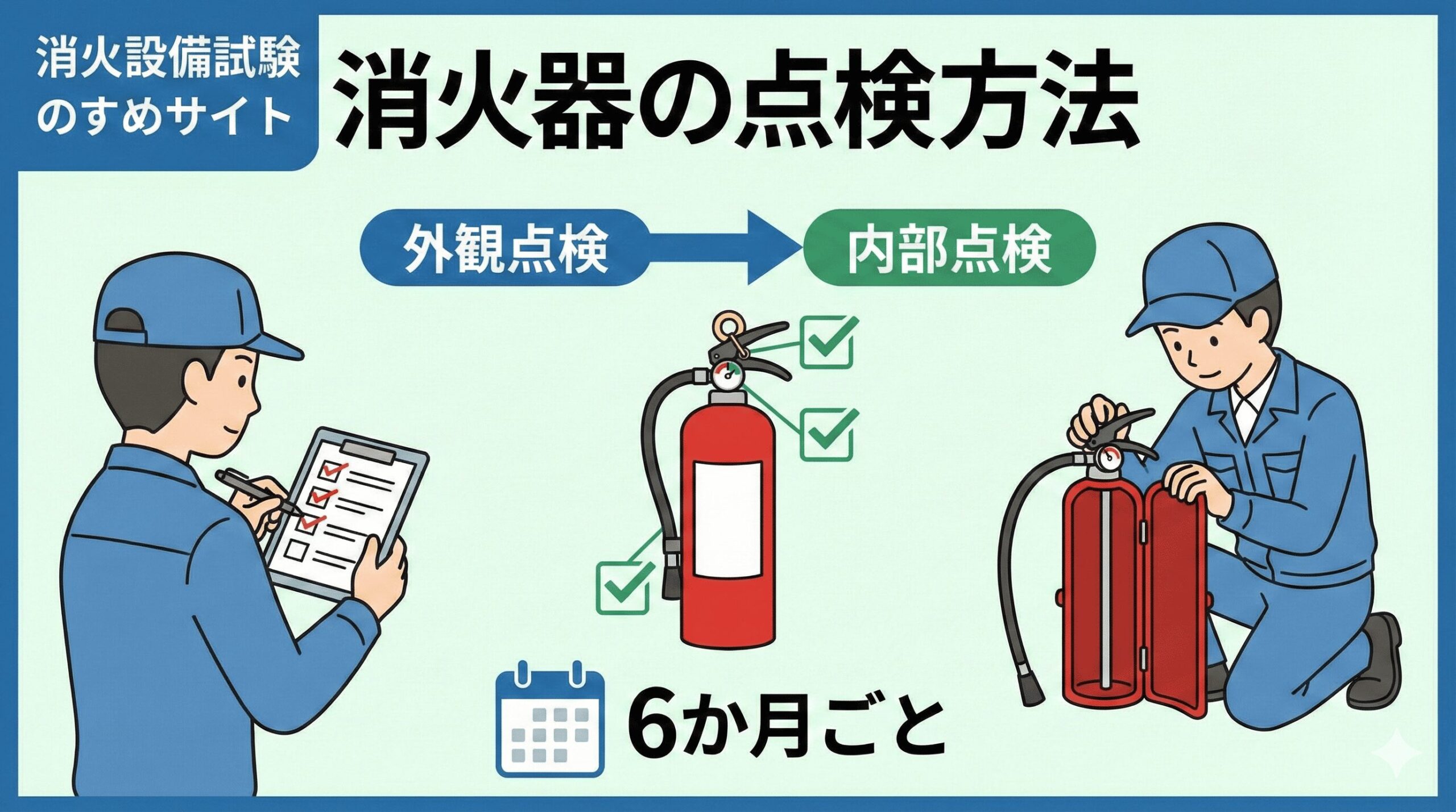 ── 外観点検と機能点検の違い。内部点検の開始時期(加圧式3年・蓄圧式5年) - 蓄圧式消火器の整備手順