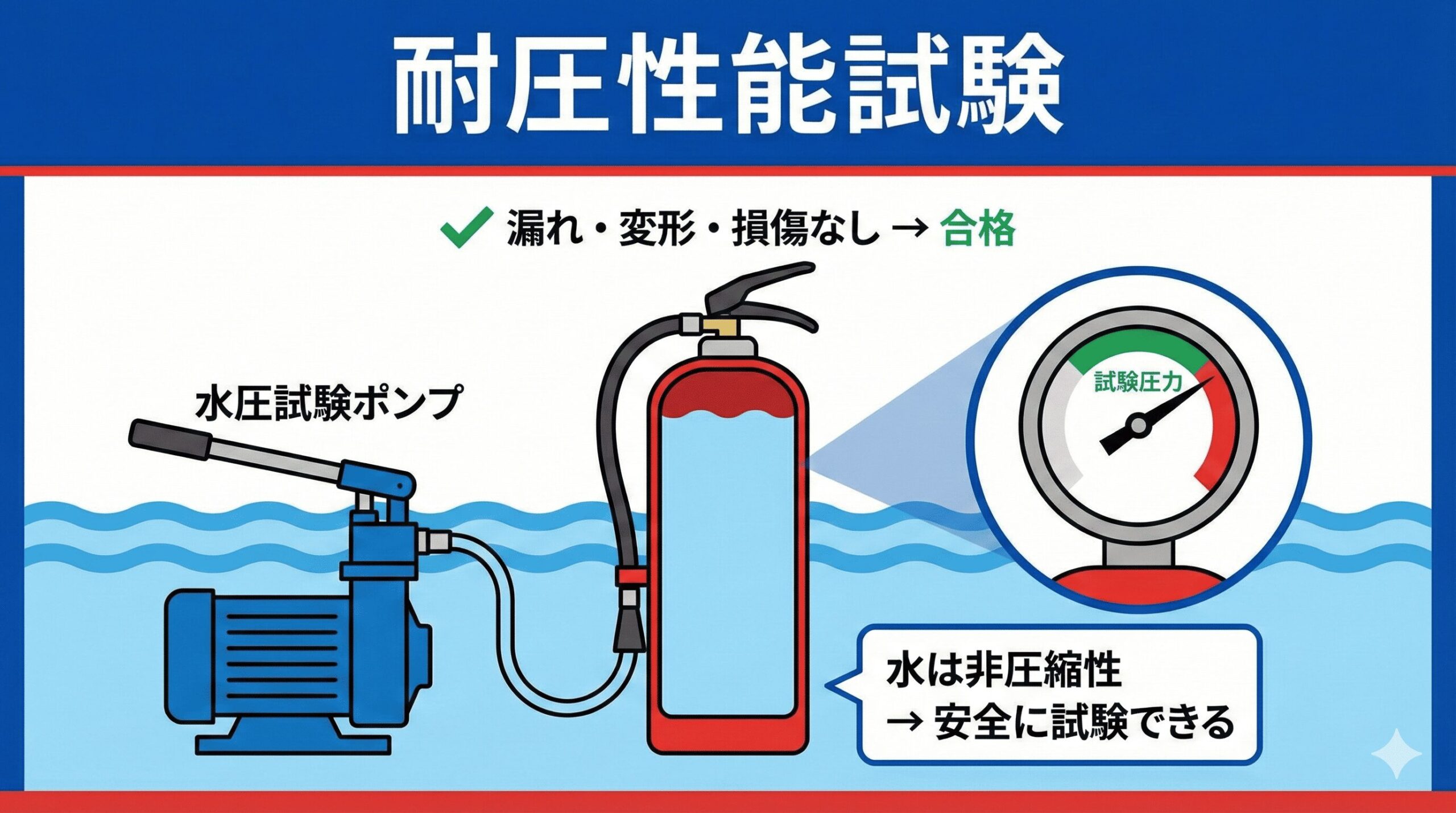 ── 水を使う理由(非圧縮性)。合否判定と不合格時の即廃棄ルール - 消火薬剤の充てん方法と注意事項