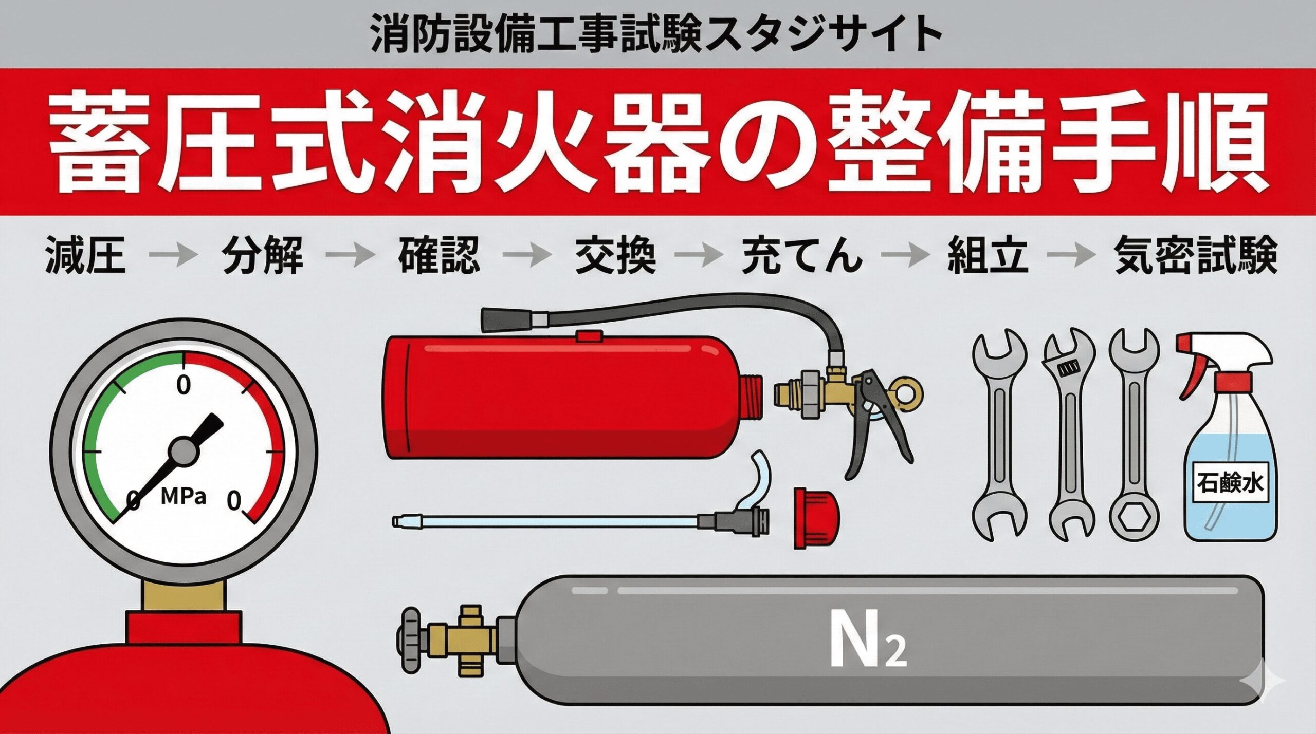 ── 7ステップ(減圧→分解→確認→交換→充てん→加圧→気密試験) - 加圧式消火器の整備手順