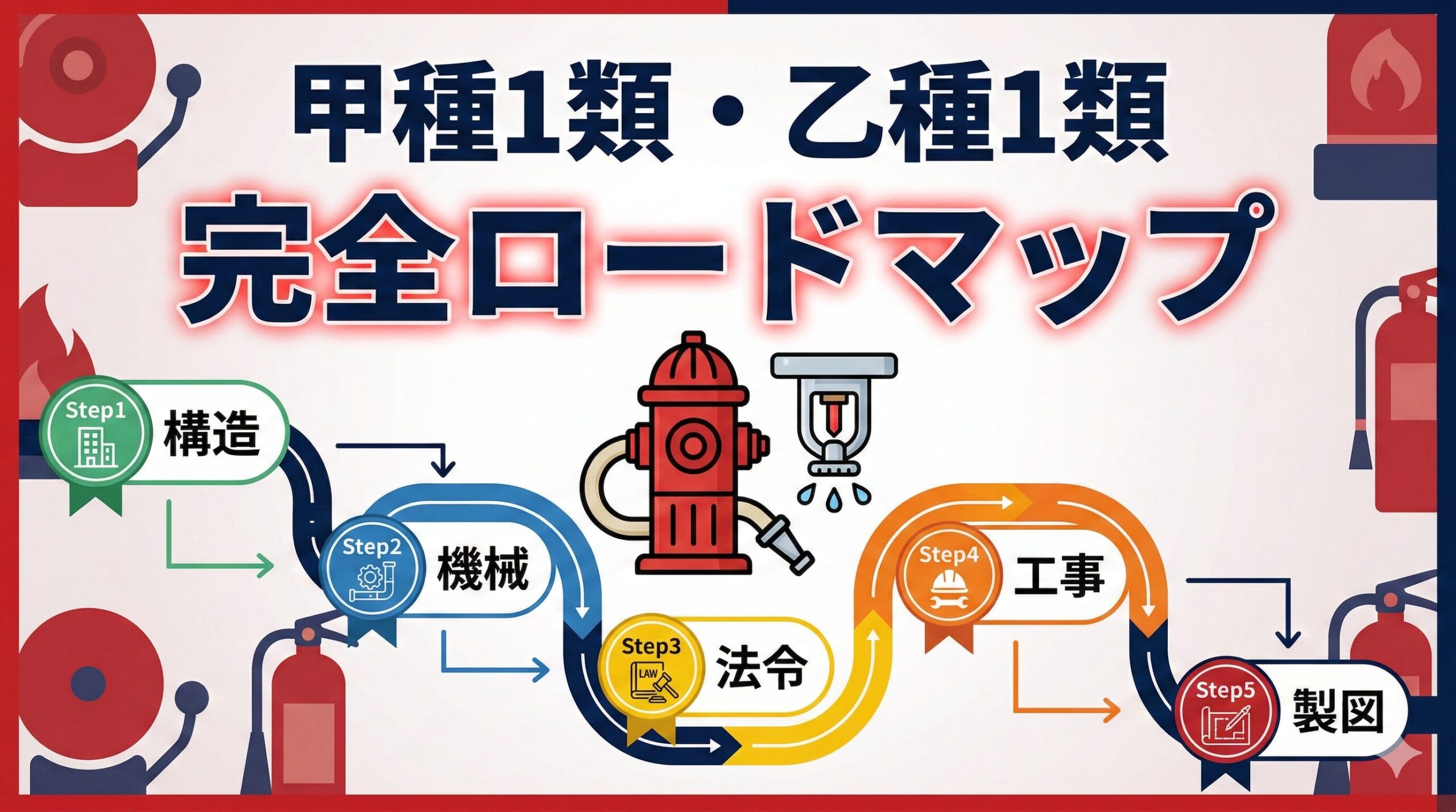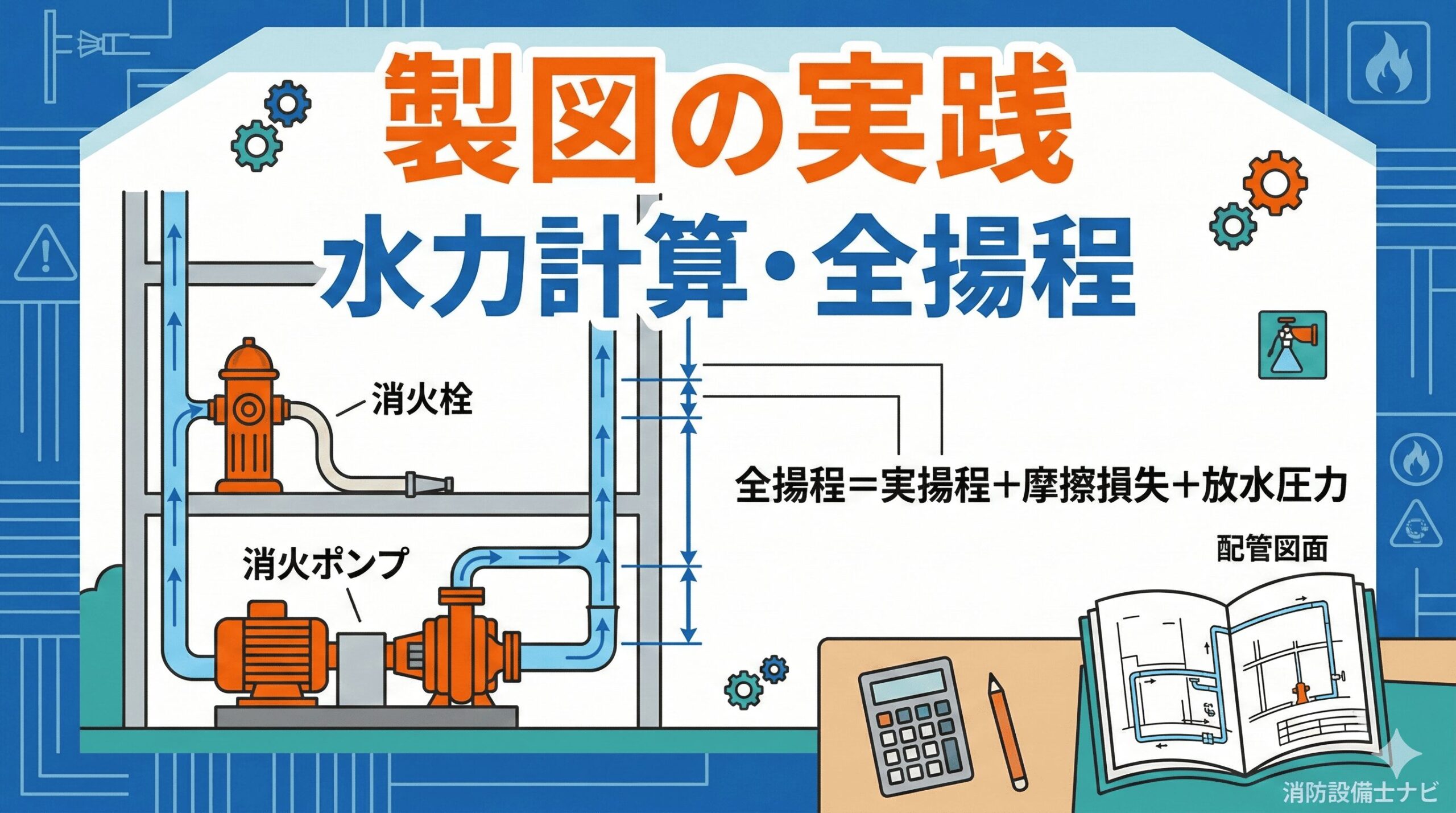 「製図の基礎|図記号・凡例・系統図の読み方」では甲種4類(自火報)の製図を解説しましたが、甲種1類の製図は水系消火設備が対象です。配管の口径選定・ポンプの揚程計算・ヘッドの配置など、4類とはまったく異なる知識が必要になります。