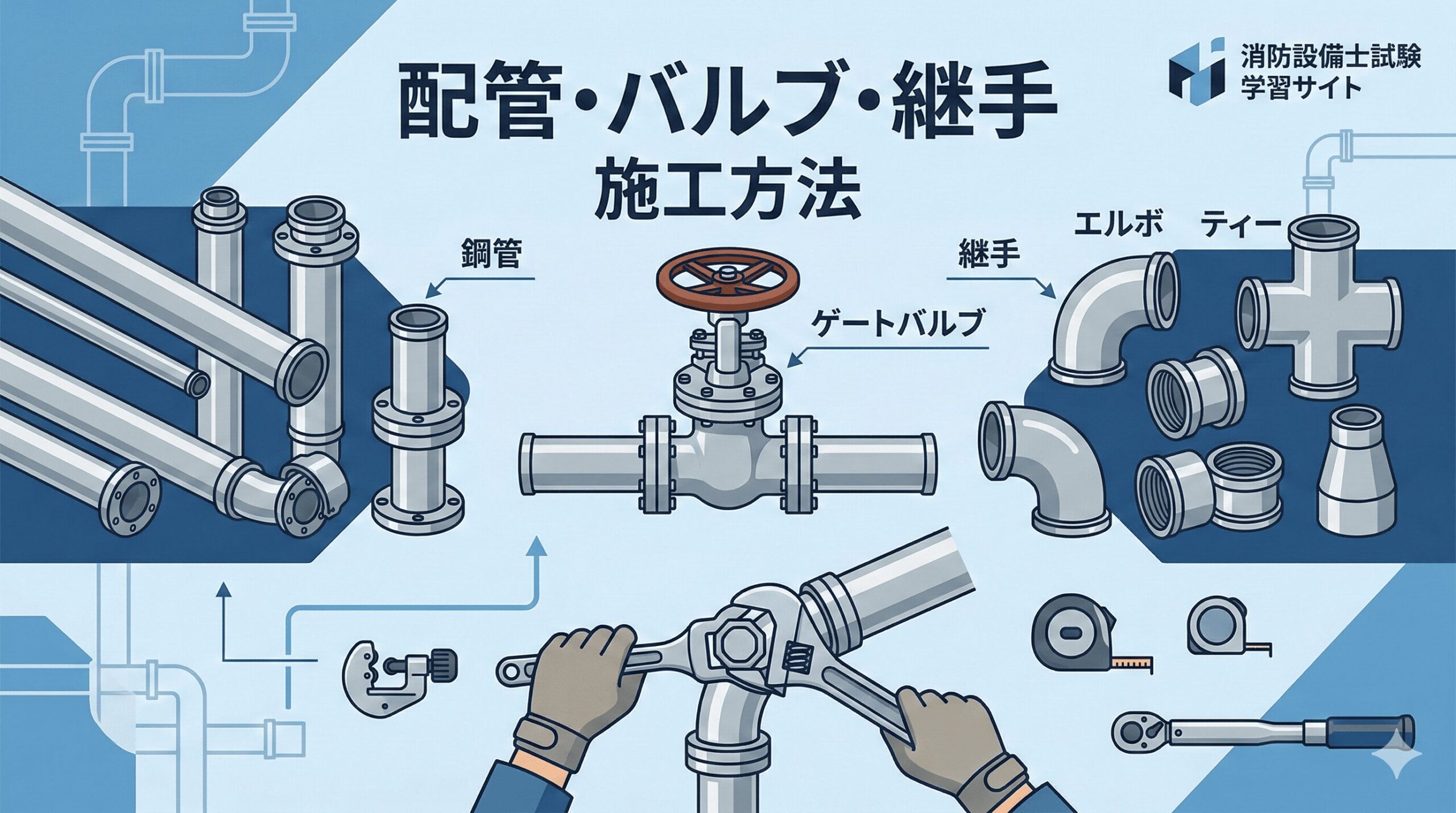 口径の「A」は日本の呼び径の単位で、たとえば100Aは外径約114mmの管です。試験では口径の数値がそのまま出題されるので、主要な口径(25A・32A・40A・50A・65A・80A・100A)を覚えておきましょう。