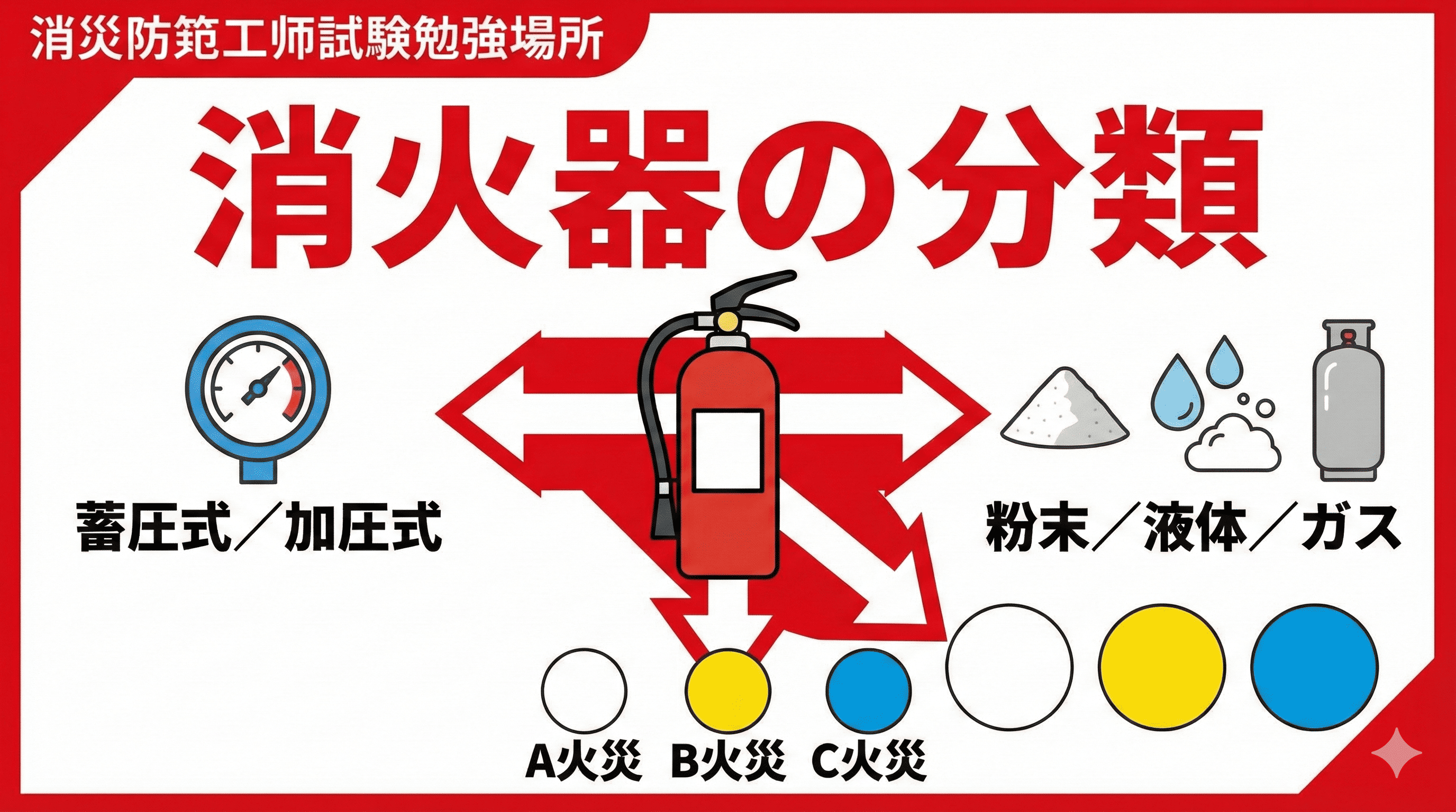 このうち"消す・水"系が第1種(①④⑤)、"知らせる・逃げる"系が第2種(②③)と考えると整理しやすいです。