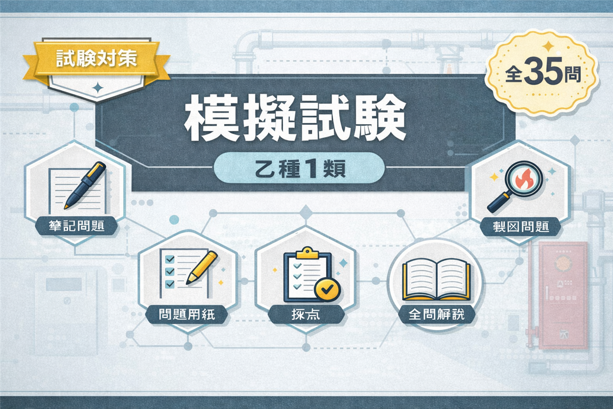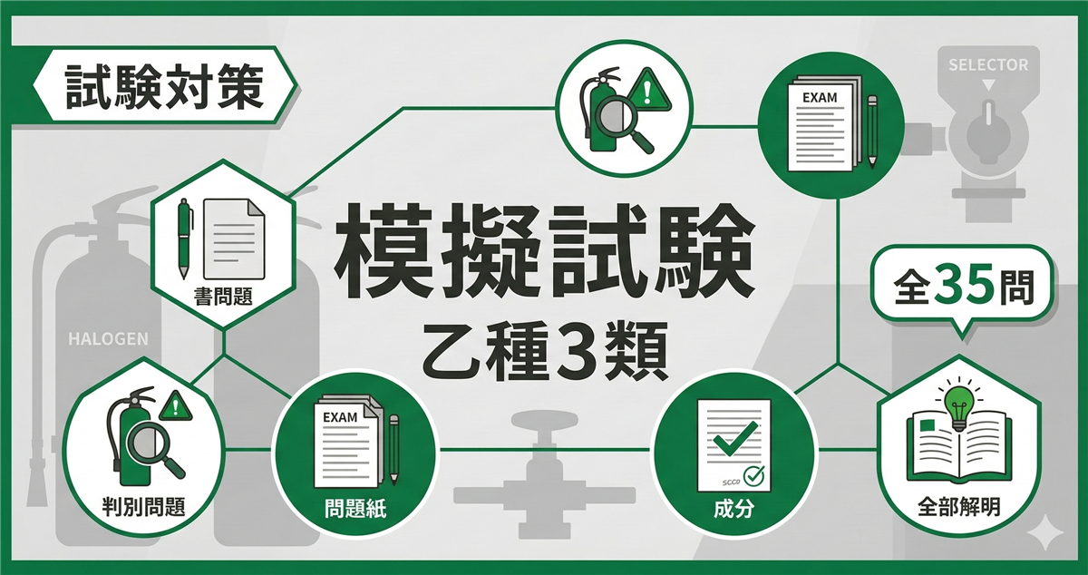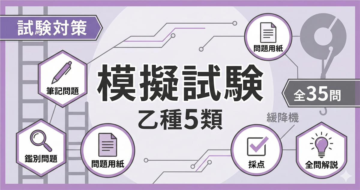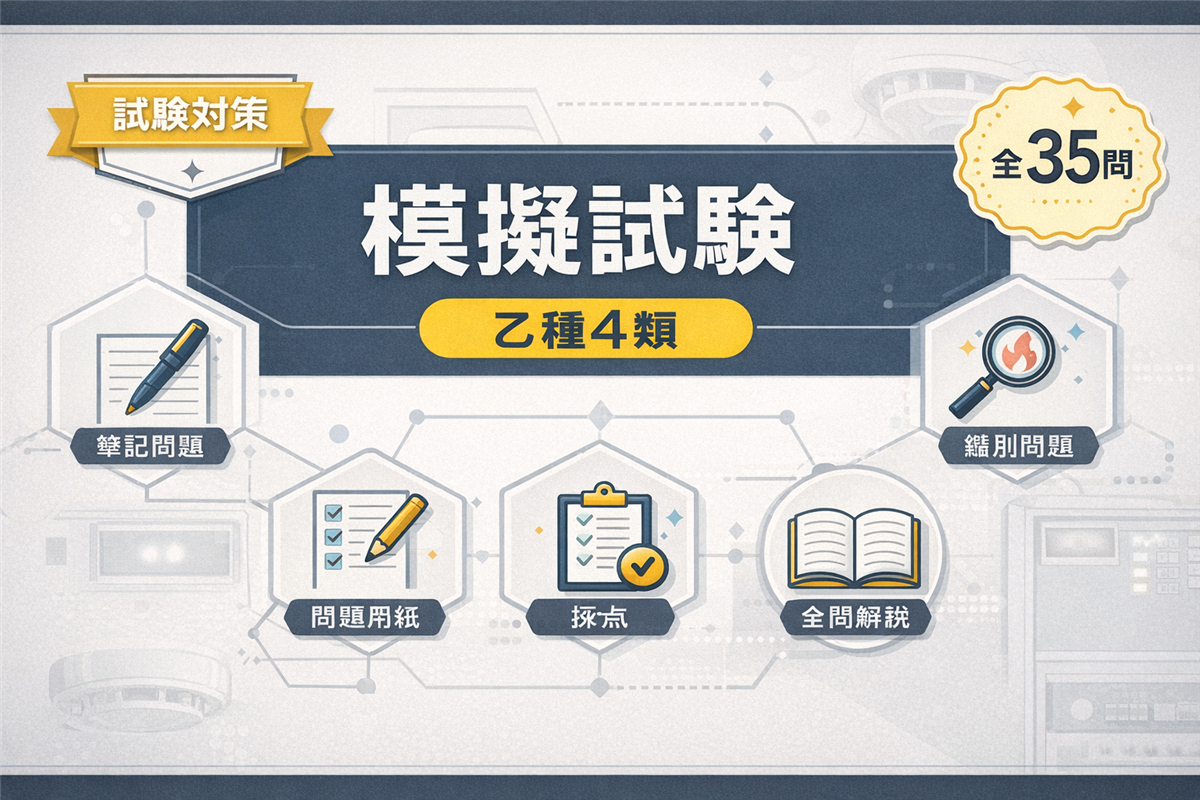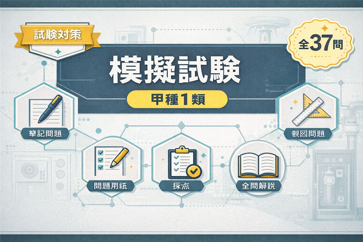 乙種5類 模擬試験(第2回)とは? この模擬試験は、乙種第5類消防設備士試験の本番を想定した全35問の実戦形式テストです。第1回とは異なる切り口から出題しています。 科目 問数 足切りライン 法令共通 6問 40%以上 法令類別 4問 40%以上 機械の基礎知識 5問 40%以上 構造・機能・整備 15問 40%以上 実技(鑑別) 5問 60%以上 合計 35問 筆記60%+実技60% 使い方 ① 解答用紙を開く② 時間を計りながら解く(目安:1時間45分)③ 解答・解説で答え合わせ 解答用紙を開く 筆記 ...