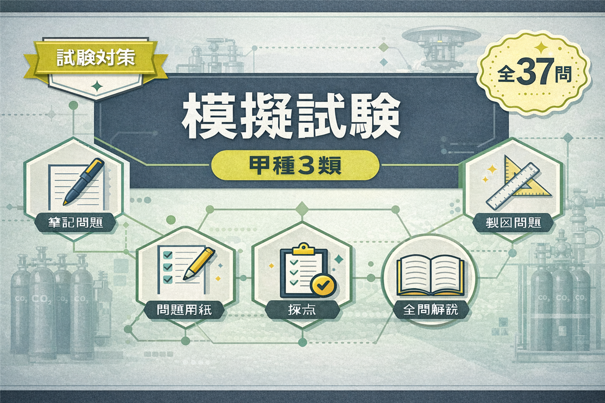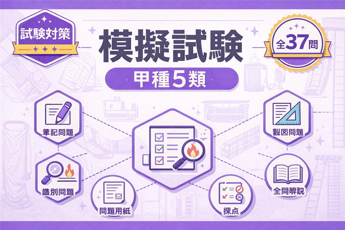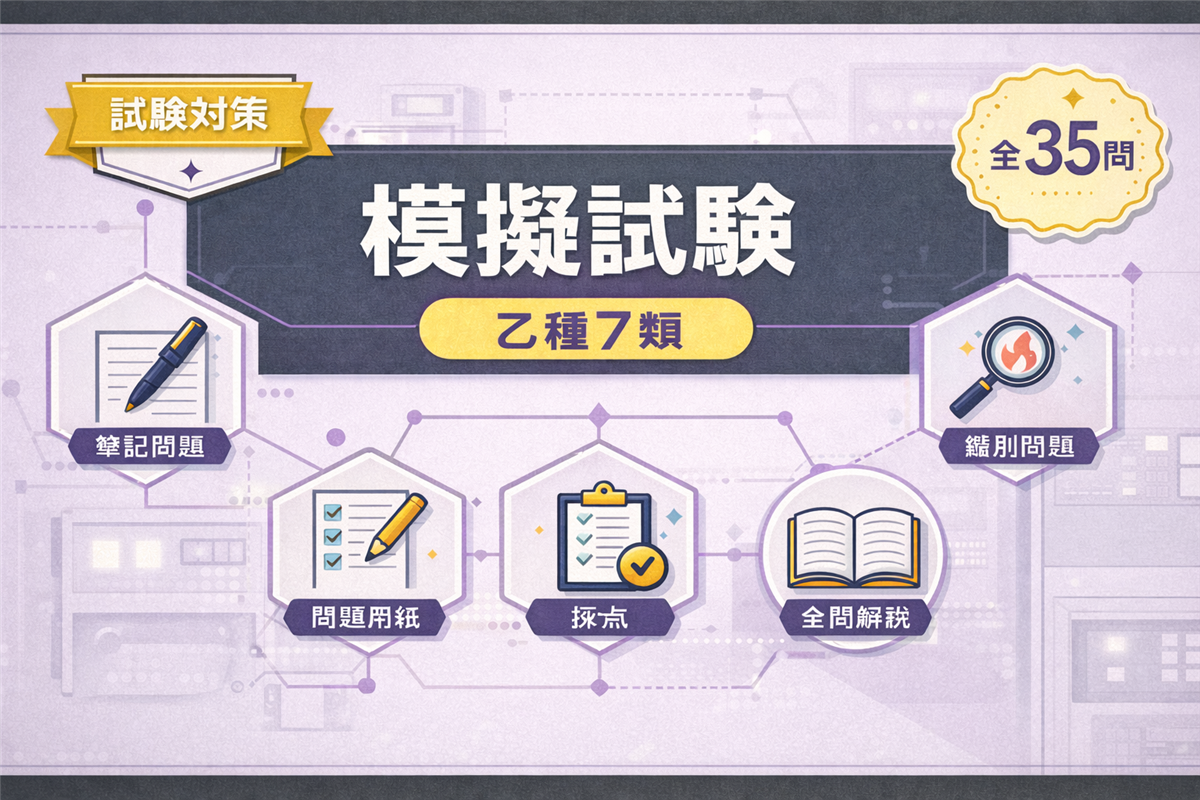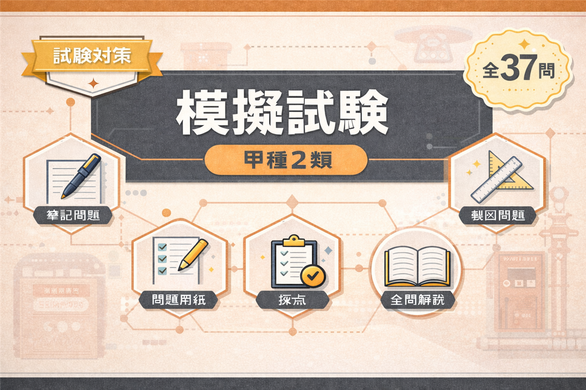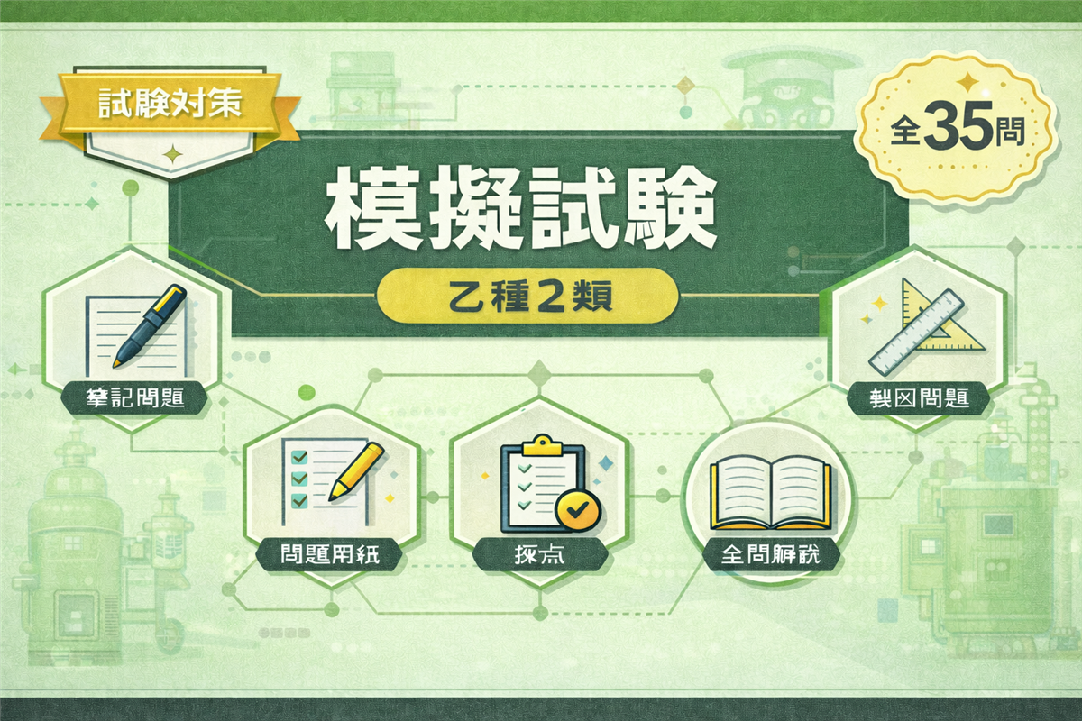 乙種5類 模擬試験(第2回)とは? この模擬試験は、乙種第5類消防設備士試験の本番を想定した全35問の実戦形式テストです。第1回とは異なる切り口から出題しています。 科目 問数 足切りライン 法令共通 6問 40%以上 法令類別 4問 40%以上 機械の基礎知識 5問 40%以上 構造・機能・整備 15問 40%以上 実技(鑑別) 5問 60%以上 合計 35問 筆記60%+実技60% 使い方 ① 解答用紙を開く② 時間を計りながら解く(目安:1時間45分)③ 解答・解説で答え合わせ 解答用紙を開く 筆記 ...